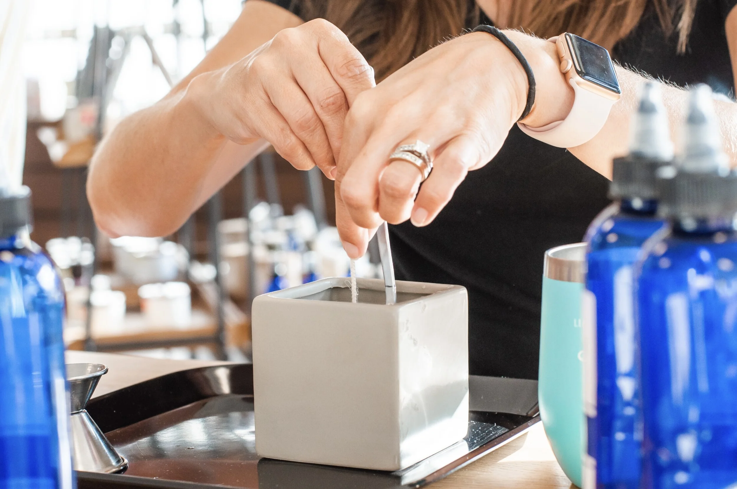 Pour your candle into a vessel of your choice. Your instructor walks you through the pouring process step by step. No experience necessary. Every guest leaves with a product they made themselves.